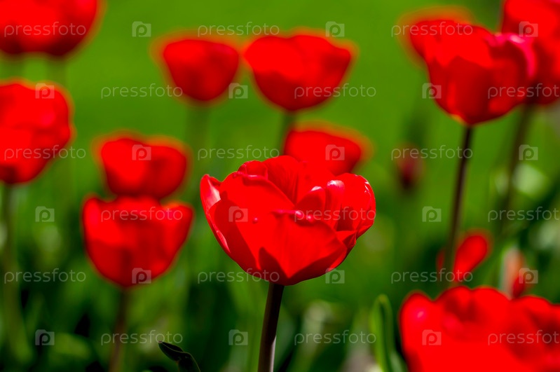 Красные тюльпаны на фоне зелени