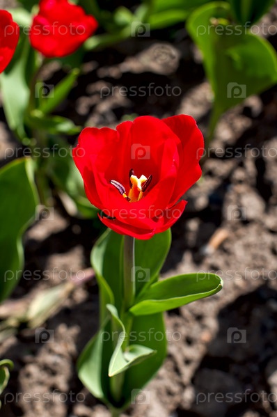 Красный тюльпан на фоне земли