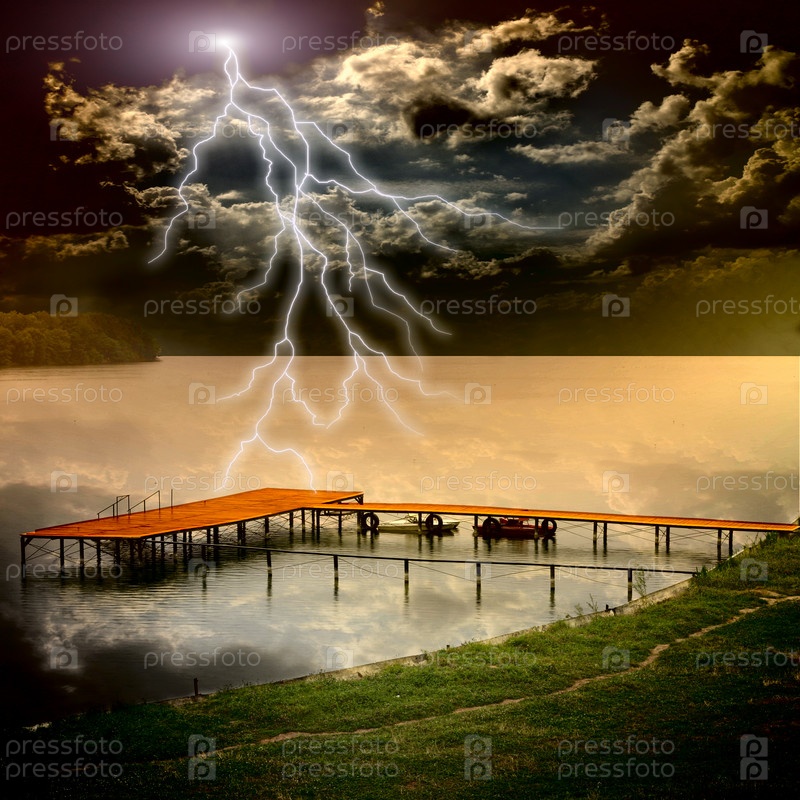 Лодочная станция на красивом озеро и штормовое небо