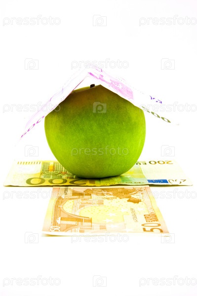 Зеленое яблоко под денежной купюрой