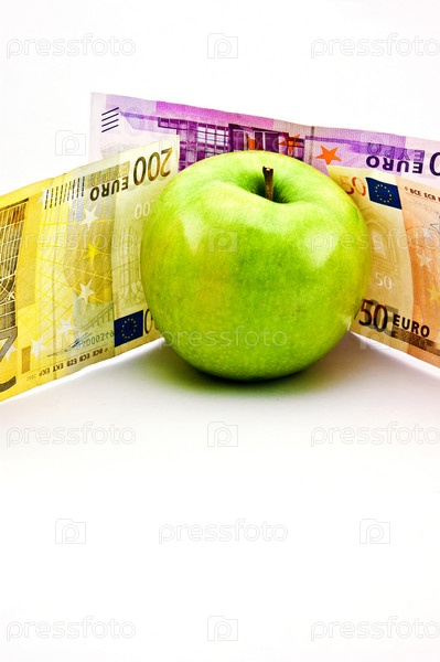 Зеленое яблоко с денежными купюрами