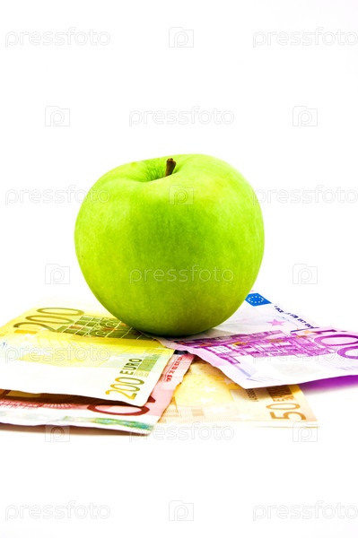 Зеленое яблоко с денежными купюрами