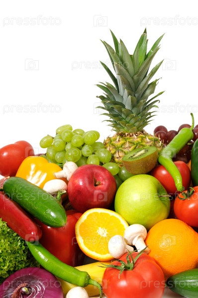 Свежие фрукты и овощи на белом фоне