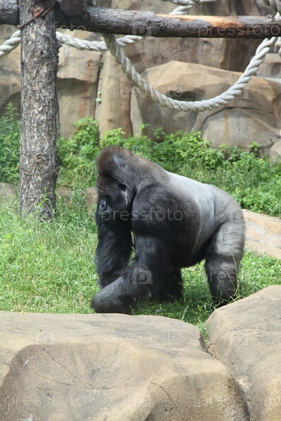 Горилла на траве в зоопарке