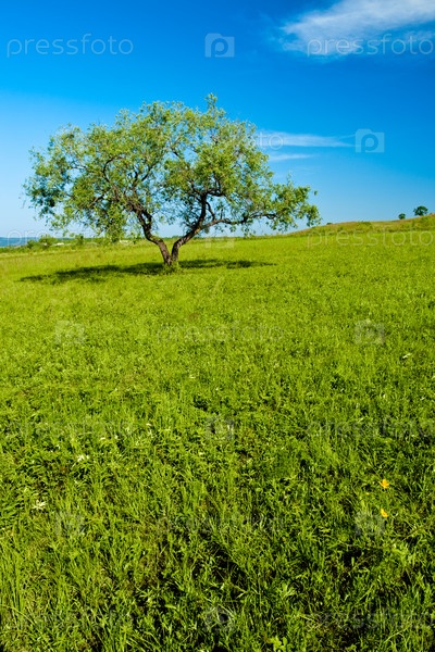 Дерево, растущее на зеленом поле