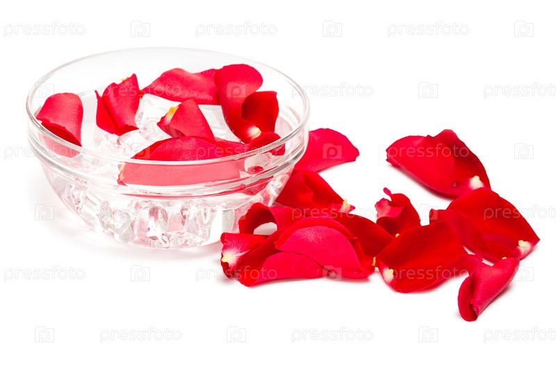 Чаша с лепестками роз на белом фоне