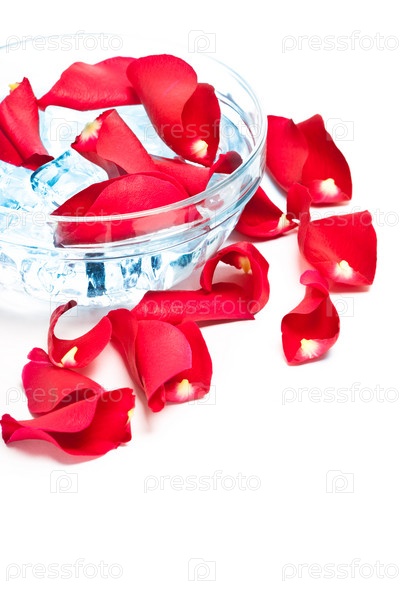 Чаша с лепестками роз на белом фоне