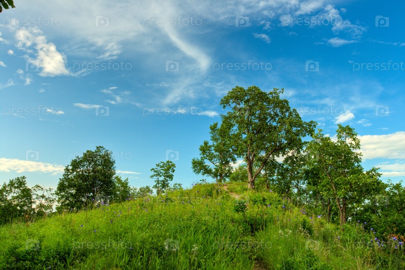 Дуб на холме под синим небом