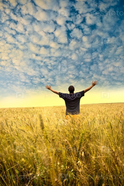Мужчина в поле пшеницы на закате солнца