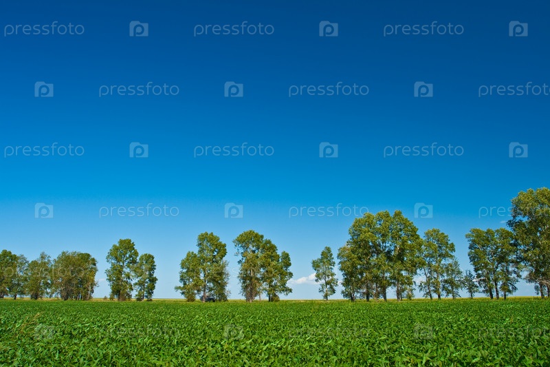 Идиллический пейзаж, соевые поля под синим небом