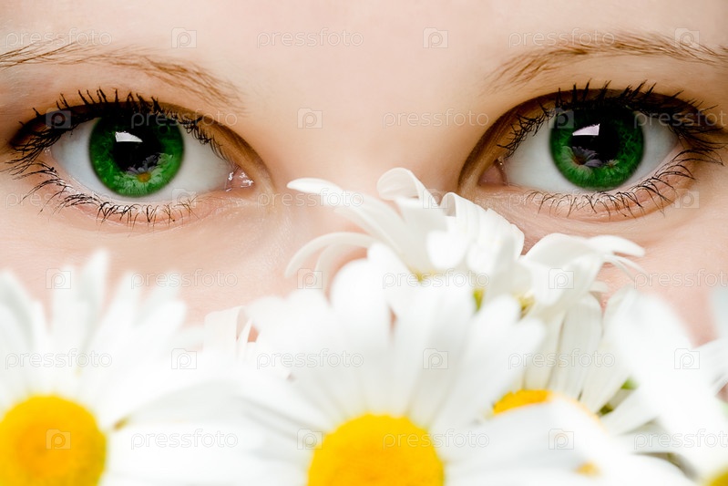 Зеленые женские глаза с ромашками
