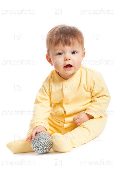 Маленький мальчик играет с серебряным мячиком