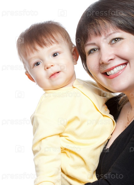 Счастливая мать и сын на белом фоне