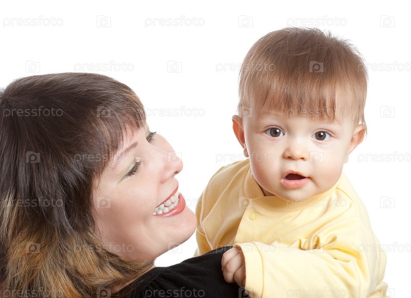 Счастливая мать и сын на белом фоне