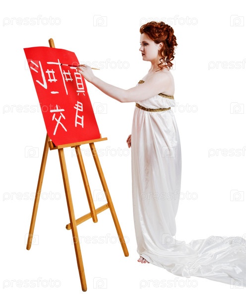 Девушка в древнегреческом костюме рисует иероглифы на доске