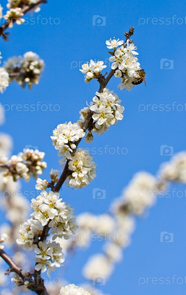 Пчела на цветущей яблоневой ветке