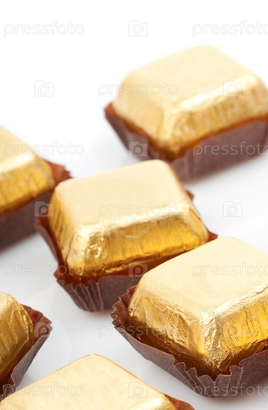 Шоколадные конфеты в фольге на белом фоне