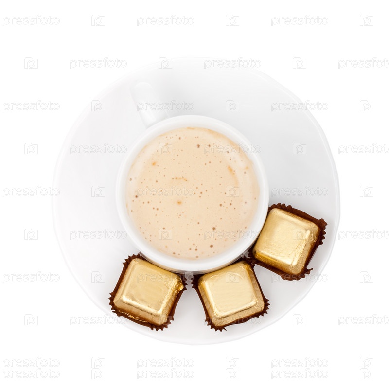 Чашка кофе с шоколадными конфетами в золотой фольге. Вид сверху