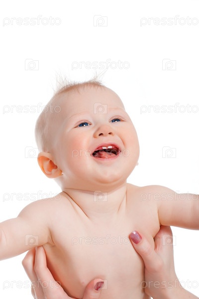 Материнские руки поднимают мальчика на белом фоне
