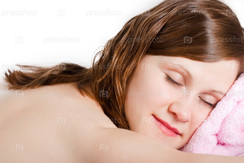 Красивая женщина лежит с закрытыми глазами на розовом полотенце