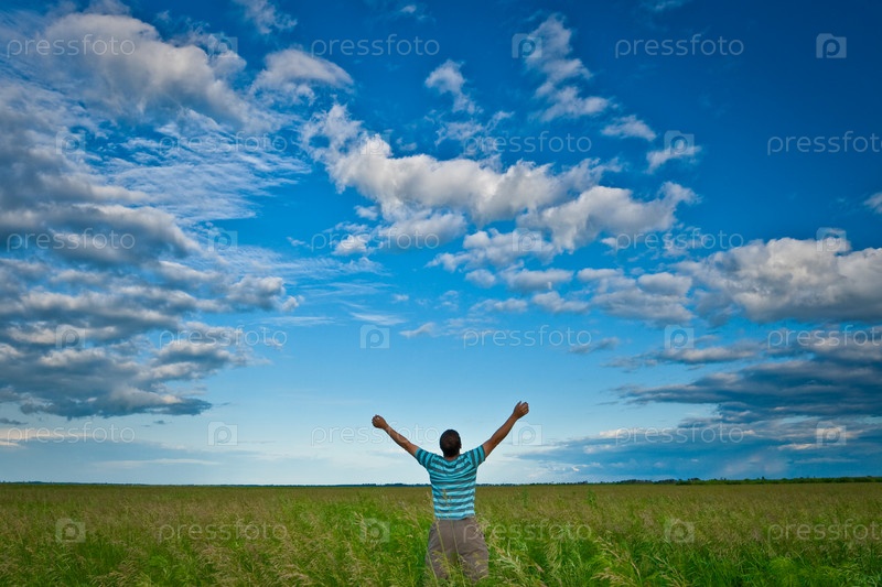 Человек стоит с поднятыми руками на фоне заката