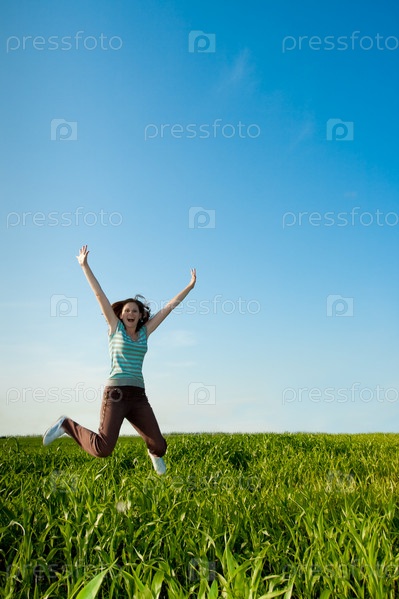 Молодая женщина прыгает на зеленые поле