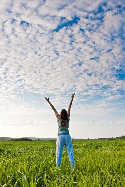 Женщина наслаждается природой на зеленом поле