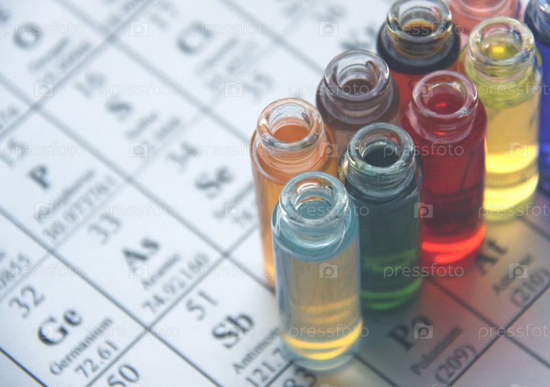 Химические вещества разных цветов в бутылочках на фоне периодической таблицы элементов