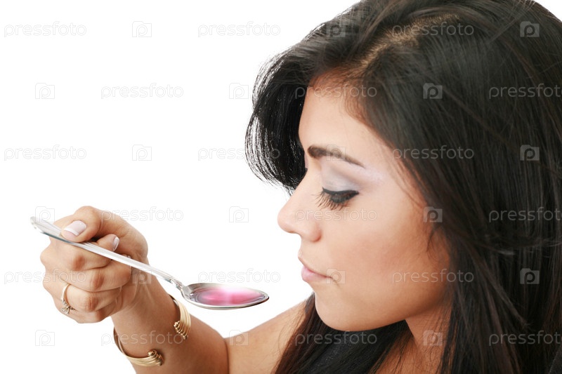 Молодая женщина пьет сироп. Основное внимание в сиропе
