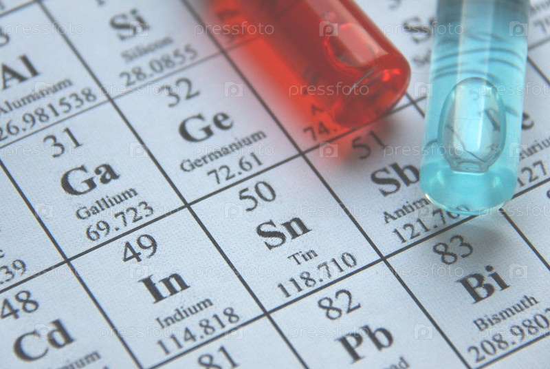 Химические вещества разных цветов в бутылочках на фоне периодической таблицы элементов