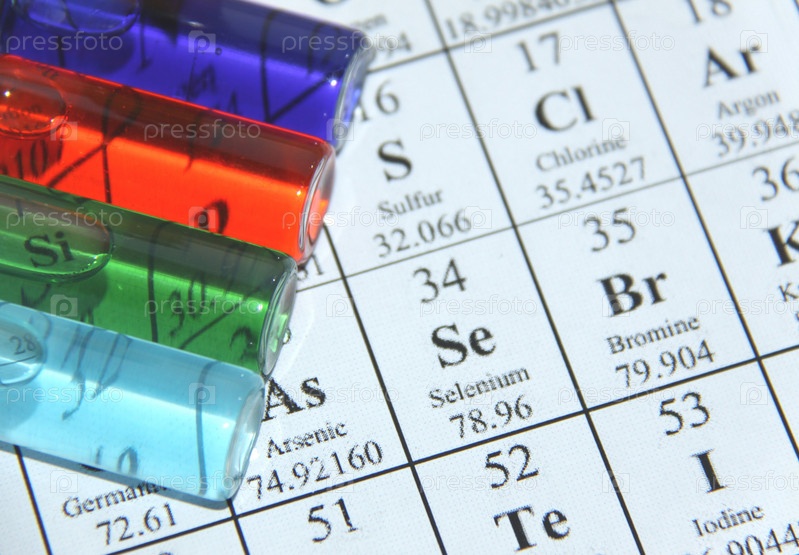 Химические вещества разных цветов в бутылочках на фоне периодической таблицы элементов