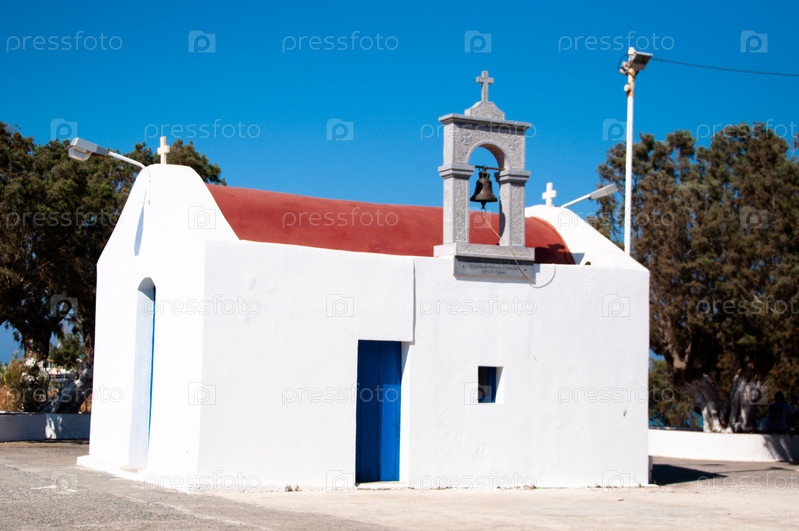 Типичная белая церквушка у моря на острове Крит. Греция
