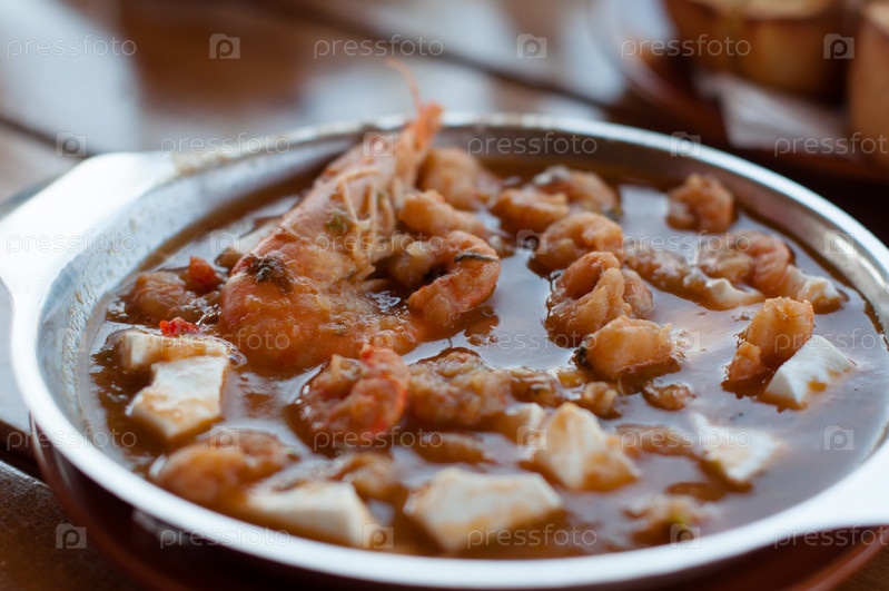 Греческая еда - жареные креветки с маслом, чесноком и сыром фета