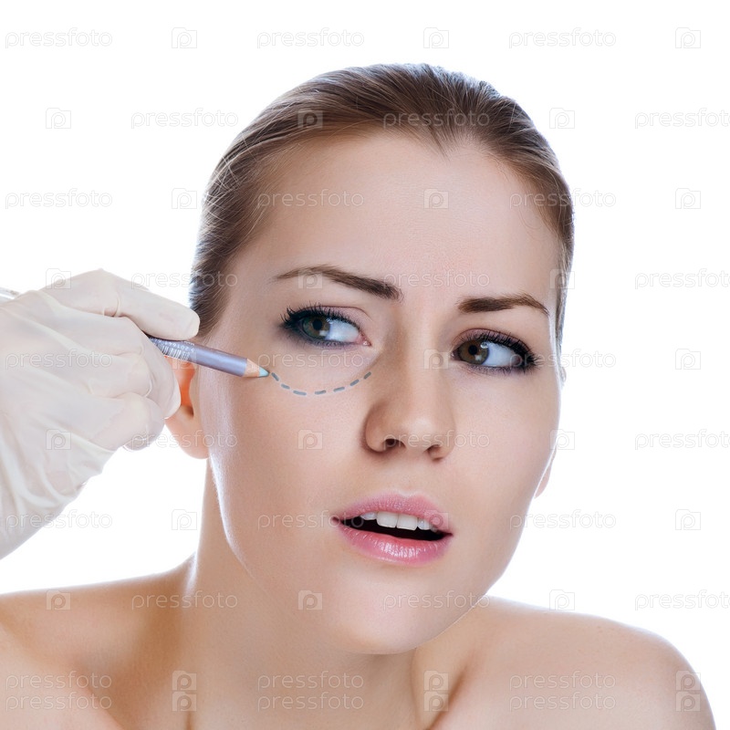 Косметолог рисует линию коррекции на лице женщины перед пластической операцией. Изоляция