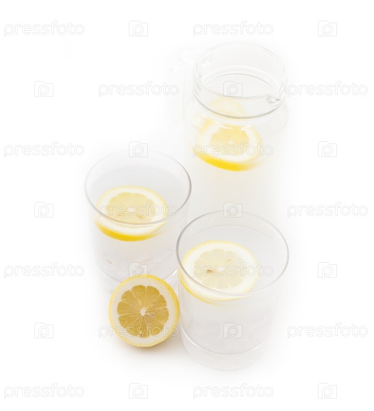 Свежий лимонад с ломтиками лимона крупным планом и кувшин, изолированные на белом