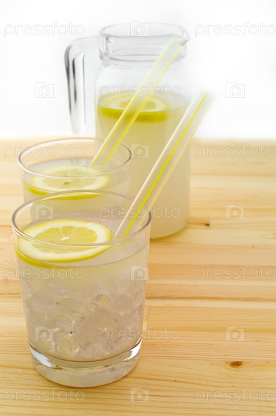 Свежий лимонад с ломтиками лимона крупным планом и кувшин на деревянном столе