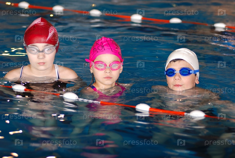 Счастливые дети на уроке плавания в бассейне