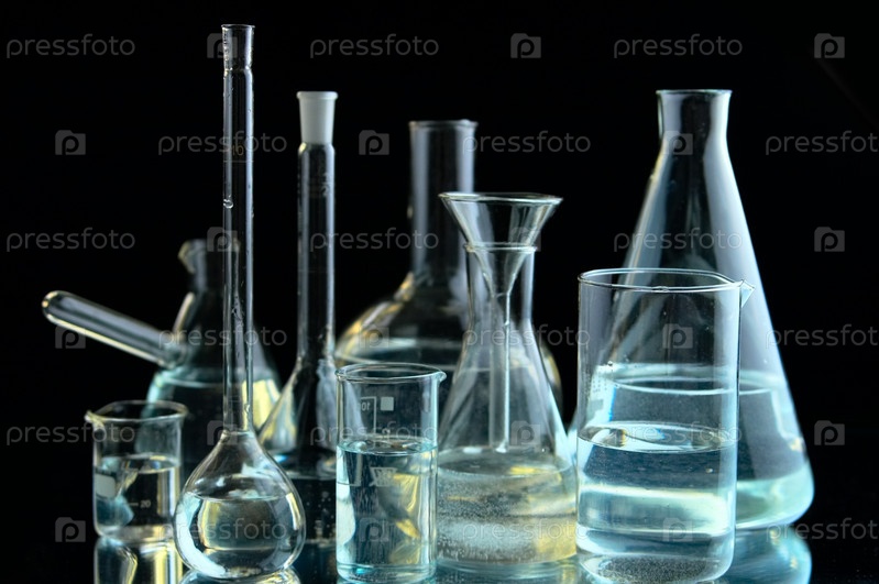 Стеклянные лабораторные колбы и пробирки с жидкостями