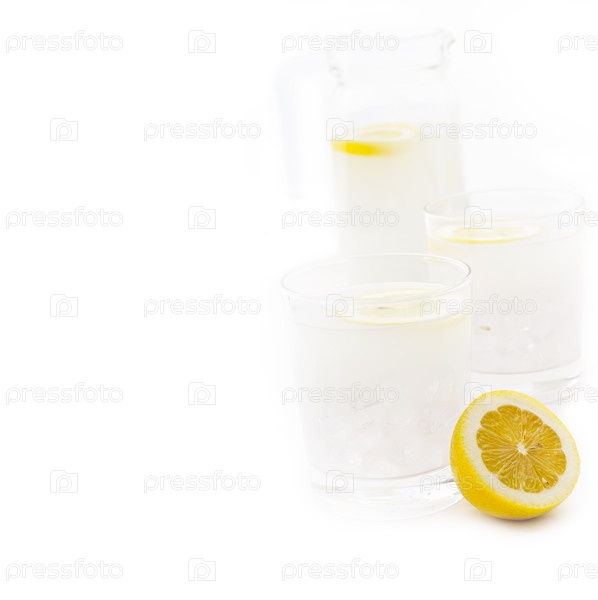 Свежий лимонный напиток в кувшине и ломтик лимона крупным планом