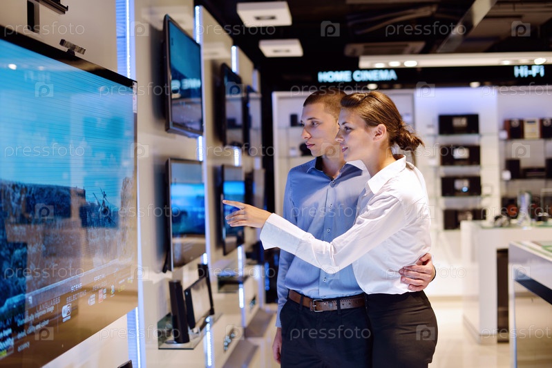 Молодая пара в магазине электроники выбирают телевизор последней модели