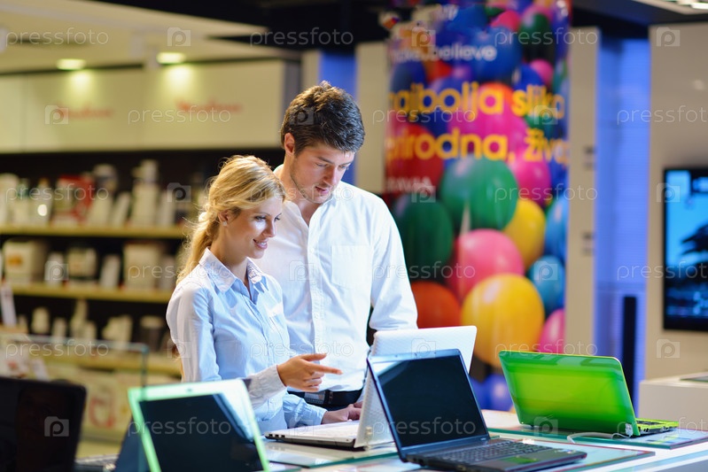 Молодая пара в магазине электроники смотрят ноутбуки последней модели