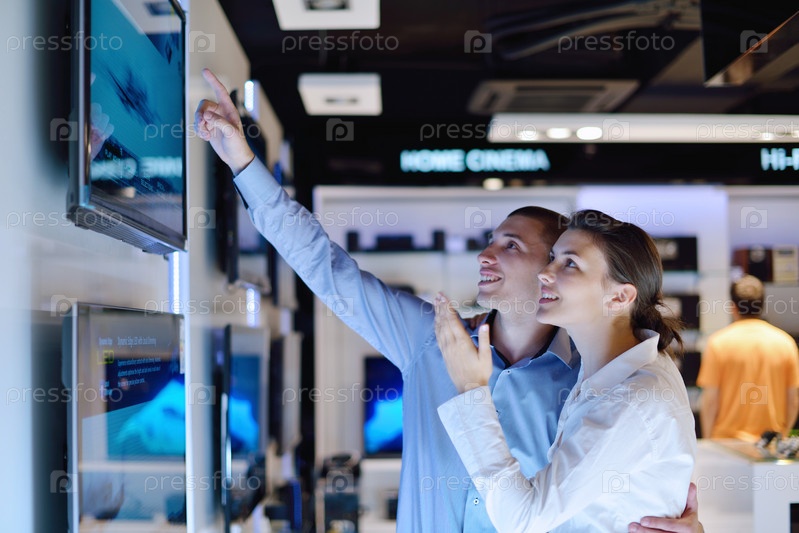 Молодая пара в магазине электроники рассматривает технику перед покупкой