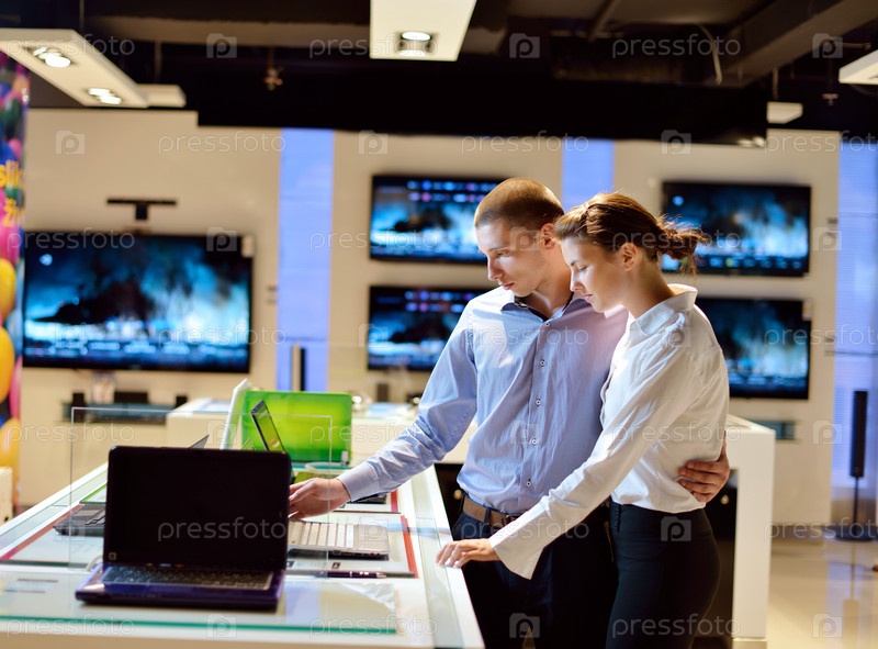 Молодая пара в магазине электроники рассматривает технику перед покупкой