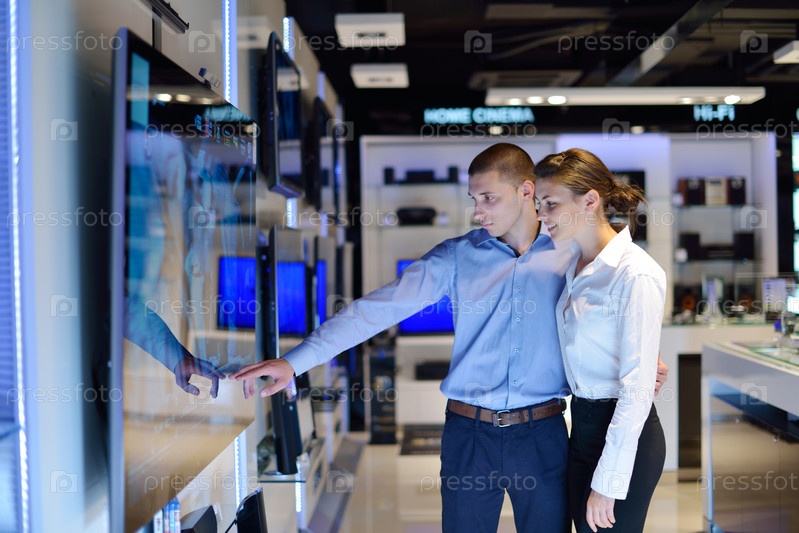Молодая пара в магазине электроники рассматривает технику перед покупкой