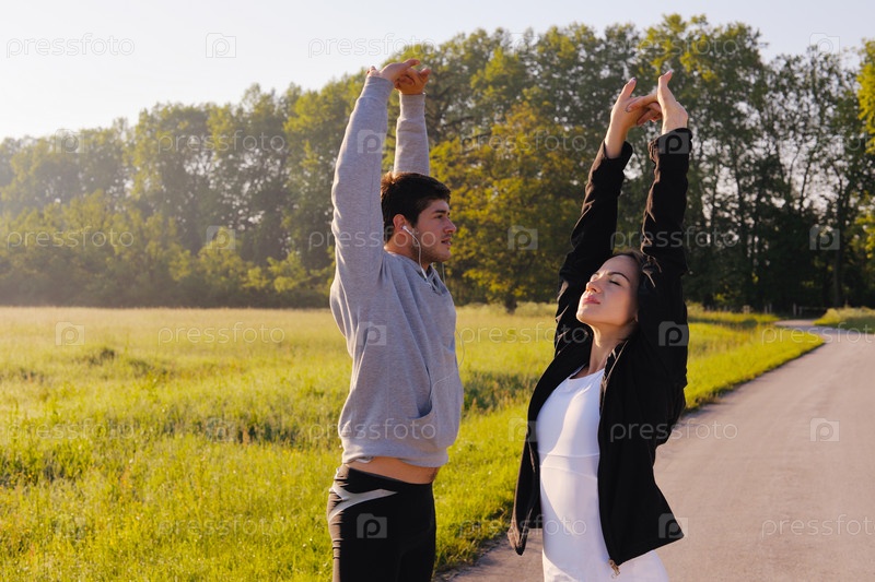Молодая пара выполняет физические упражнения на открытом воздухе