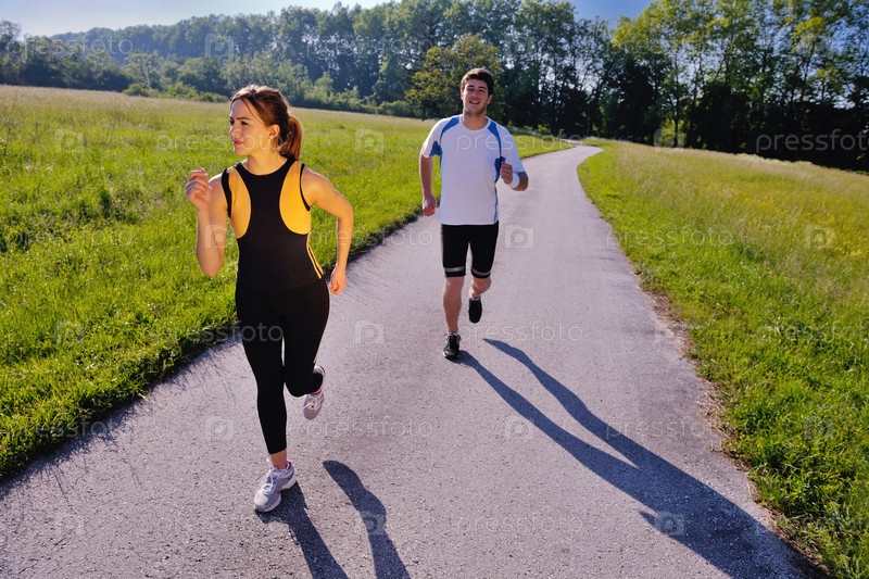 Молодая пара на утренней пробежке в парке. Здоровье и фитнес