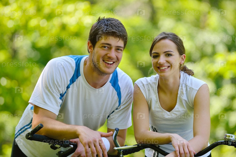 Счастливая пара с велосипедами на открытом воздухе