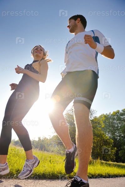Молодая пара на утренней пробежке в парке