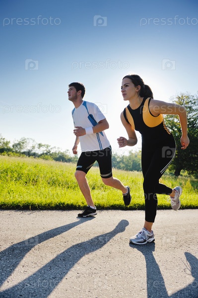 Молодая пара на утренней пробежке в парке. Здоровье и фитнес