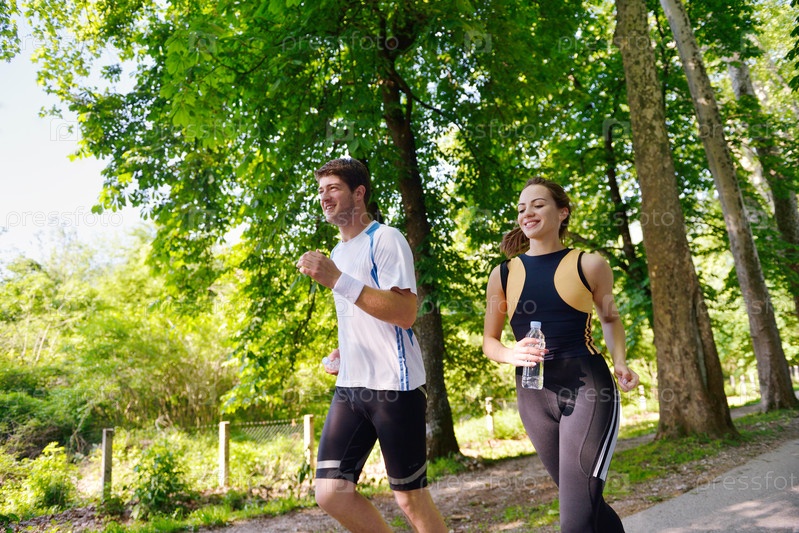 Молодая пара на утренней пробежке в парке. Здоровье и фитнес
